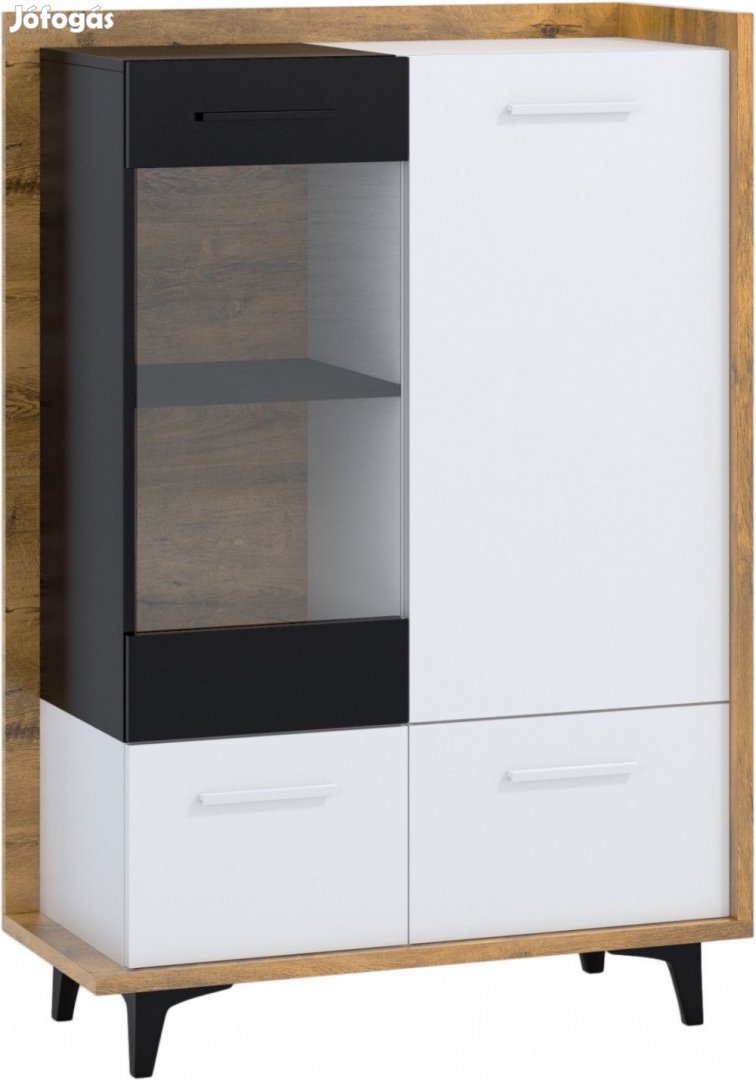 Felül egyik oldalon 1-ajtós üveges vitrines, másik oldalon zárt ajtós, alul pedig 2-ajtós szekrény polcokkal, burgundy tölgy, fehér és fekete színben. További információkért kattintson ide: