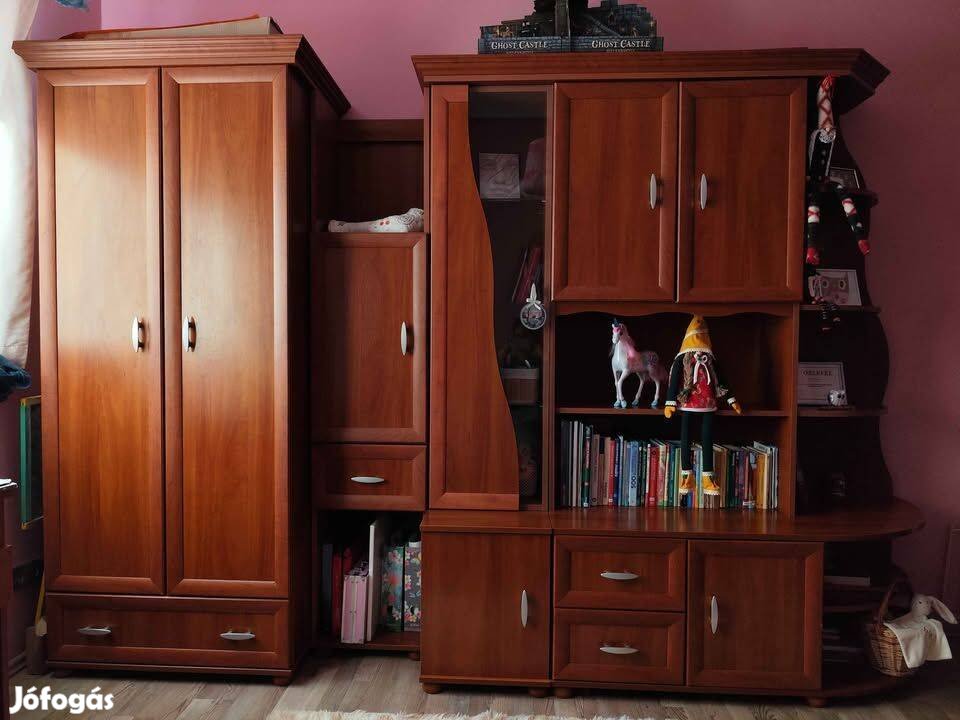 Eladó szekrénysor calvados színben. Használat jeleivel, de összességében szép állapotban. Ezeket fotóztam. Szállításhoz elemekre bontható. Méretek elemeként: akasztós: 80 széles x54,5 cm mély, polcos elem: kb. : 40x40 cm, üvegajtós elem szintén 40x40 cm felül, az alja 53 cm mély, ajtós -polcos és sarokpolcos elem egyben : 53 cm mély és 130,5 cm széles. A tetején a díszítő elem kb. 5cm-re lóg ki. Megtekinthető, átvehető Veszprém-Gyulafirátóton (8412). Szállításban nem tudok segíteni. Nem bontom meg, csak egyben eladó.