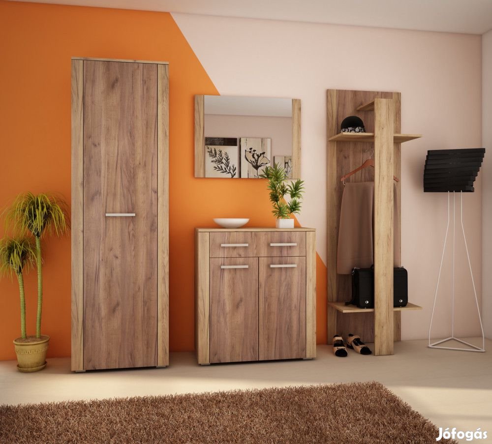 Előszobafal vállfatartóval, akasztós szekrénnyel, tükörrel, és ajtós fiókos komóddal, arany tölgy és tobacco tölgy színben. További információkért kattintson ide: