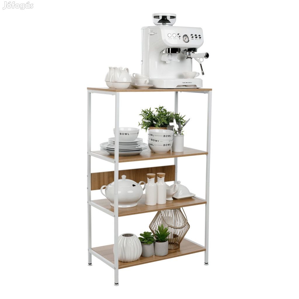 Egy stabil fémszerkezeten áll, fehér színben. Ezt négy polc egészíti ki, amely MDF anyagból készült sonoma tölgy változatban.