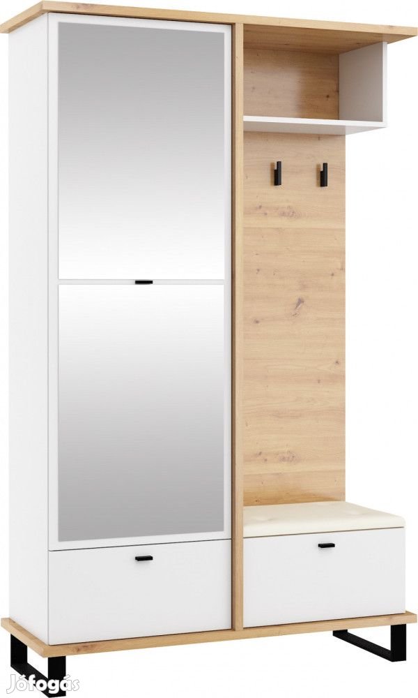 Előszobafal vállfatartós szekrénnyel, tükörrel, cipőtartó szekrényekkel és fogasokkal, artisan tölgy és fehér színben, bézs huzattal. További információkért kattintson ide:
