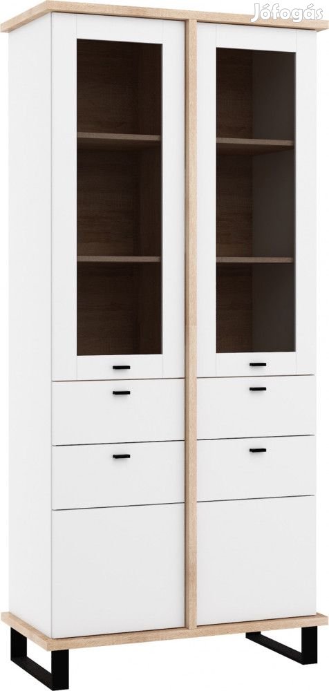 Felül 2-ajtós üveges vitrines, alul 2-ajtós és 2-fiókos szekrény polcokkal, világos sonoma tölgy és fehér színben. További információkért kattintson ide: