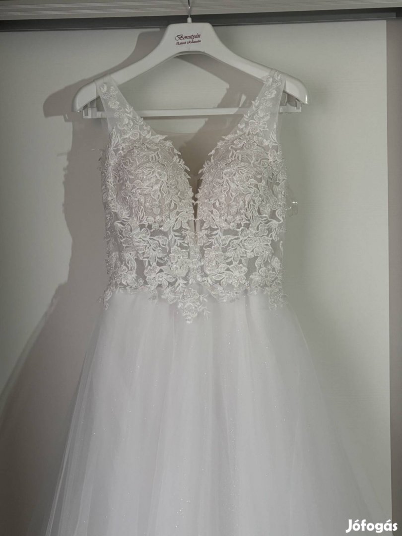 Eladóvá vált gyöngyökkel és csillámmal ellátott báli/menyasszonyi ruha. Szalonból vásárolt, hibátlan állapotú, hátul fűzős, 3 rétegű tüllszoknya része szintén csillogó. Frissen tisztítva. A derék mérete változtatva volt (kiengedhető). A ruhát 36-38-as méretnek mondanám. 163cm magassággal, kisebb sarkú cipővel viselt, így sem ért le teljesen a földre. Abroncs ingyen jár hozzá.