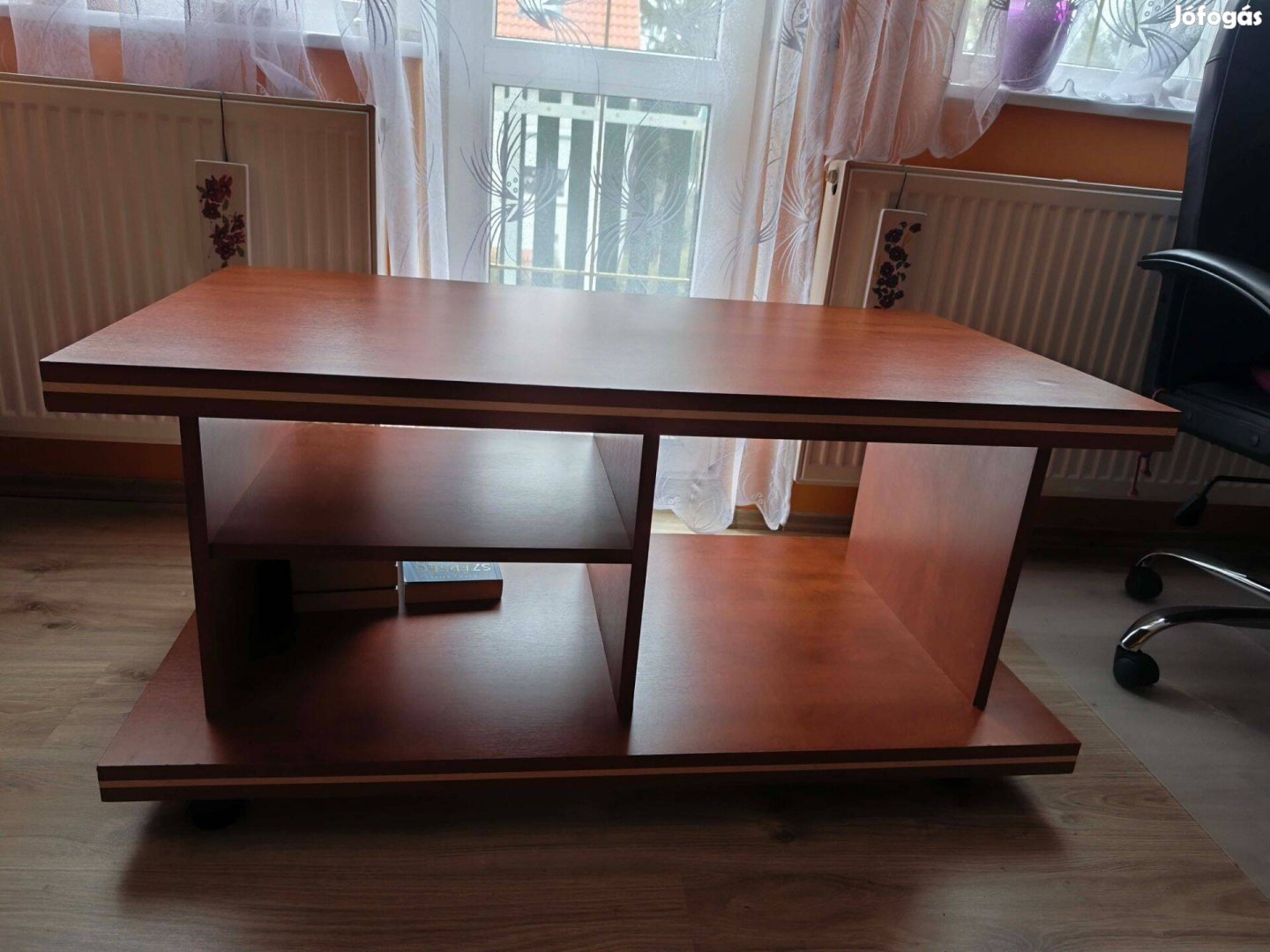 Nagyméretű calvados szinű, dohányzóasztal eladó. 60x110 cm, 52 cm magas. 4 cm bútorlapbból van, stabil, masszív, jól kihasználható részekkel. Görgőket szereltünk rá, így könnyen mozgatható. Két karc van az asztallapon, fotóztam.