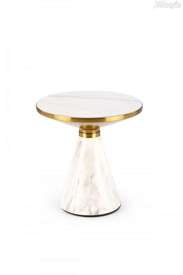 Az asztal különleges fehér márvány hatású szinterezett kőből és porszórt acélból készült, amit arany színű rozsdamentes acél elemek egészítenek ki, így biztosítva a luxus megjelenést.