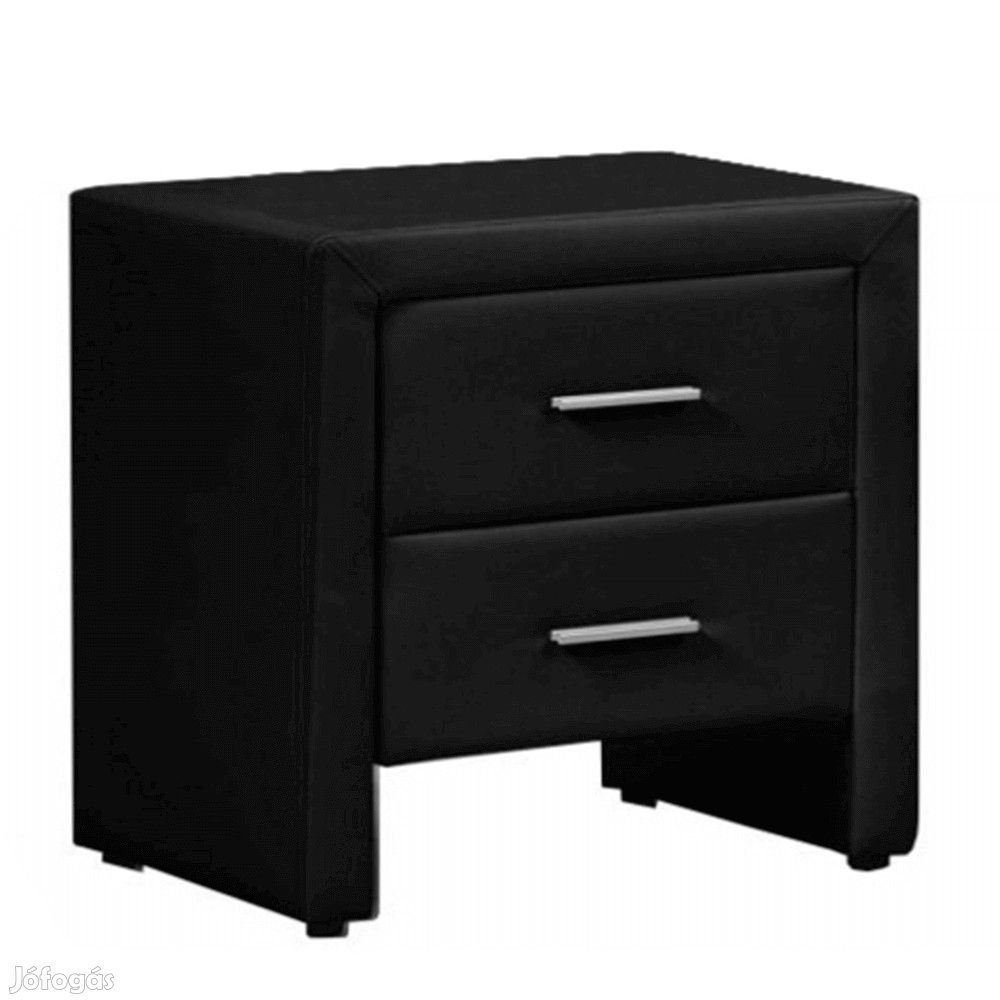 Ez az éjjeliszekrény nemcsak dizájnban, hanem használatban is kiemelkedik. Kettő fiókkal rengeteg tárhelyet biztosít. Az éjjeliszekrény alacsony lábakon áll, amely kíméli a padlót. Fekete textilbőrrel van bevonva.