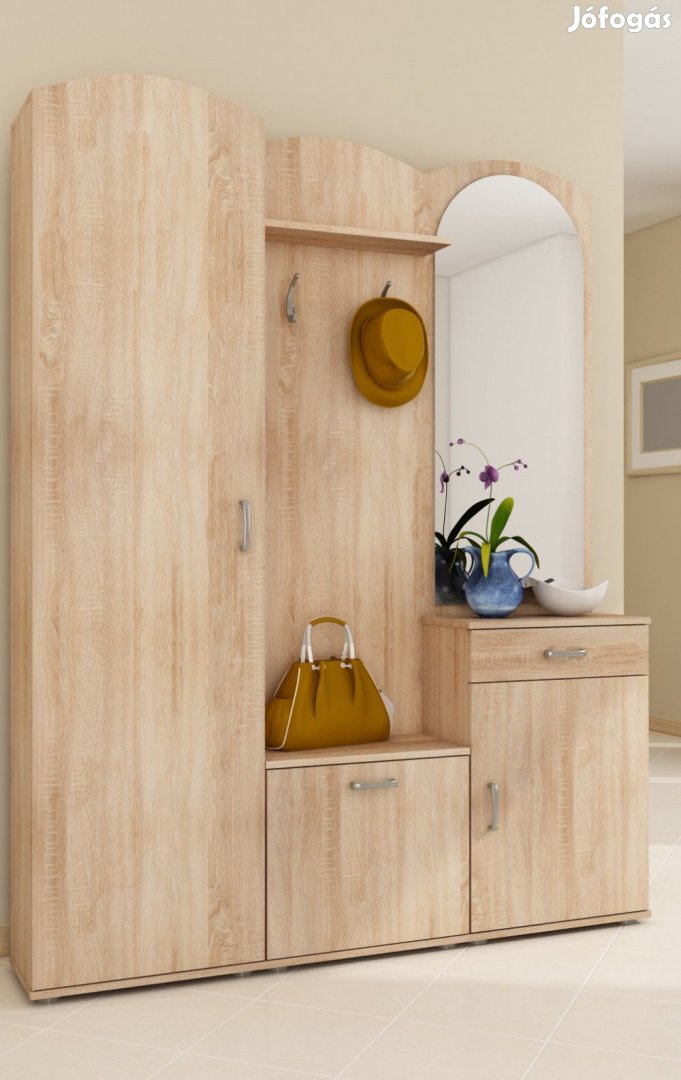 Komplett előszoba bútor szett, magas egyajtós felül egy polcos vállfatartós szekrénnyel, lenyílós cipőtartó szekrénnyel, 1-ajtós 1-fiókos komóddal, akasztós előszobafallal és tükörrel, világos sonoma tölgy színben. További információkért kattintson ide: