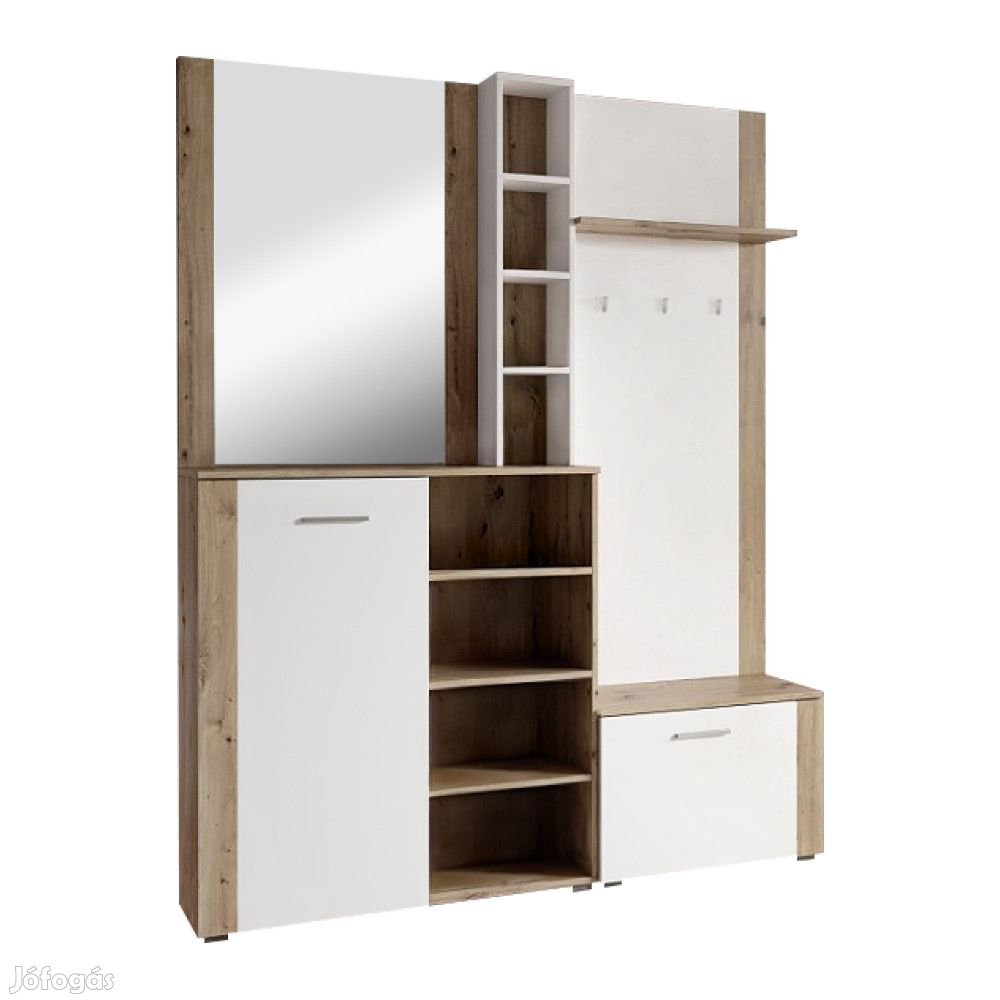 Ez az előszobai szett egy praktikus és stílusos kiegészítő, amely nem hiányozhat az otthonából. A készlet rengeteg tárhelyet kínál egy ajtós szekrény formájában, amely mögött polcok, cipőtartó, akasztók és nyitott polcok találhatók. Értékelni fogja a tükröt is, amely eleganciát kölcsönöz a készletnek, ugyanakkor hasznos, hiszen távozás előtt gyorsan ellenőrizheti benne a külsejét.