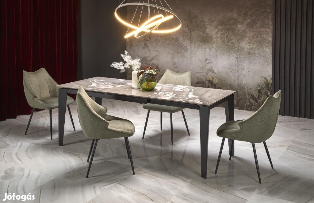 A szürke márvány hatású asztallap elegáns megjelenést kölcsönöz a térnek, miközben könnyen tisztítható és tartós.