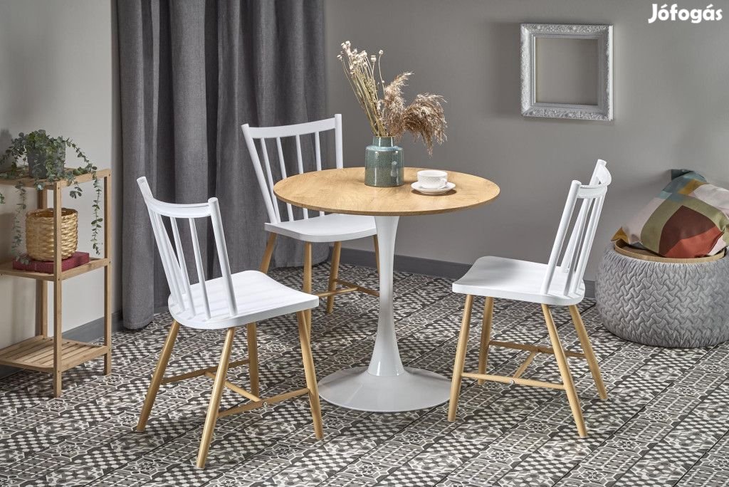 Az étkezőasztal asztallapjának színe arany tölgy, a láb színe fehér.