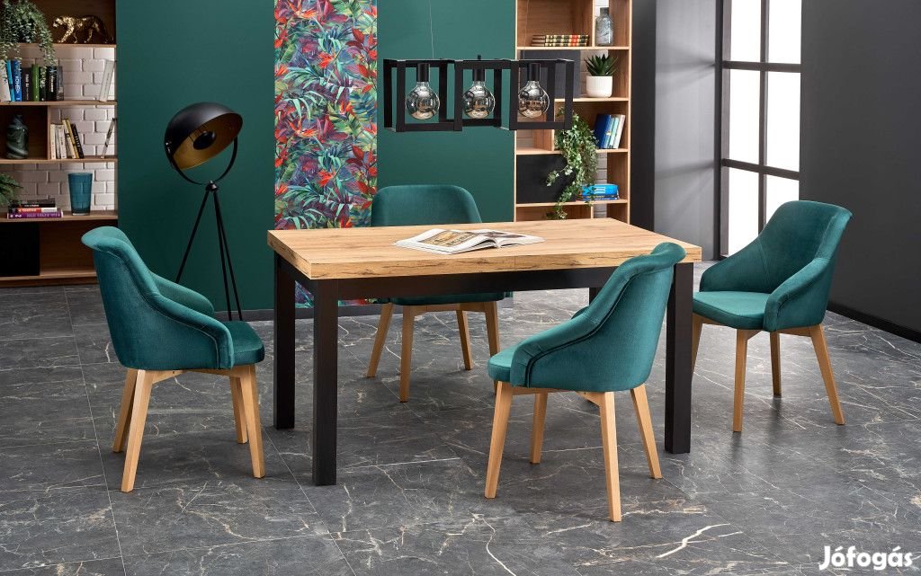 Az étkezőasztal kinyitható, megnagyobbítható, az asztallap színe arany craft tölgy, a lábak színe fekete.