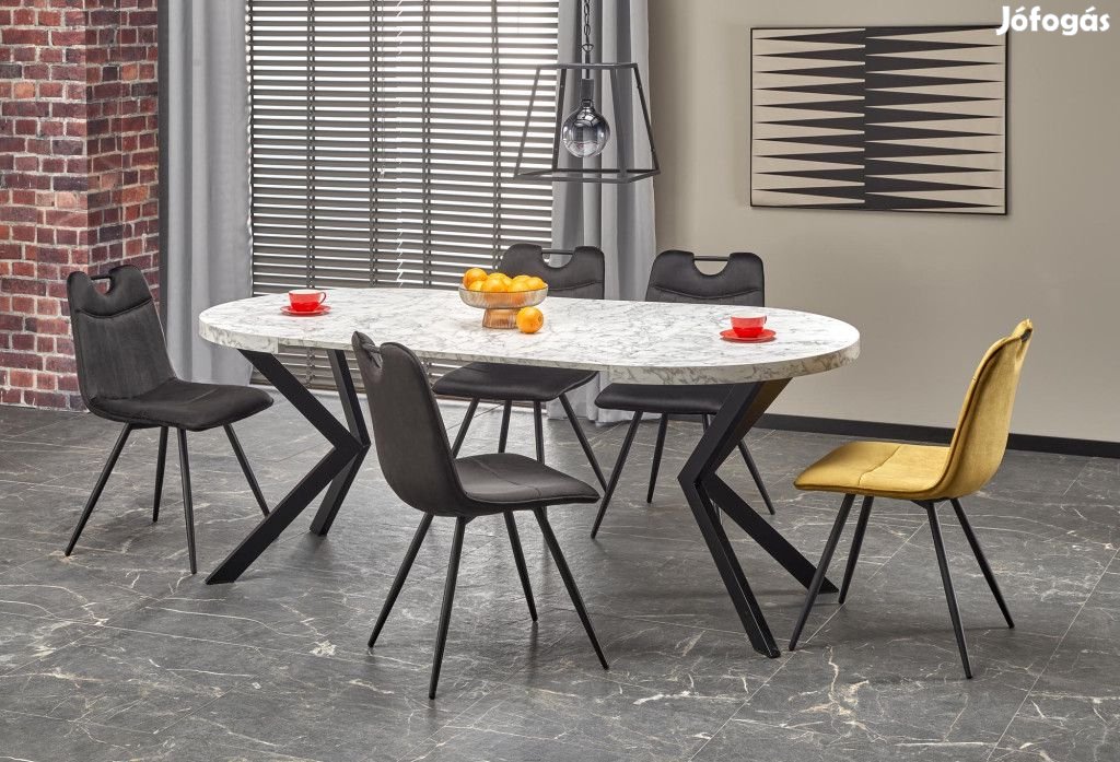Az étkezőasztal asztallapjának színe fehér márvány, a lábak színe fekete.