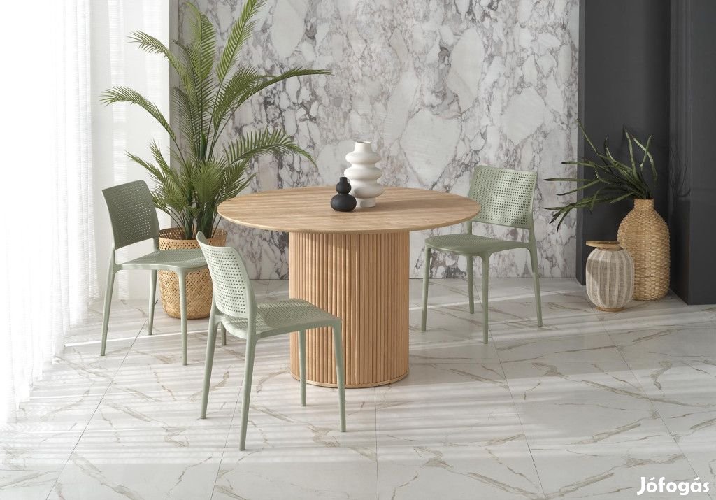 Elegáns megjelenésű, modern stílusú, kör alakú fa asztallapos étkezőasztal.