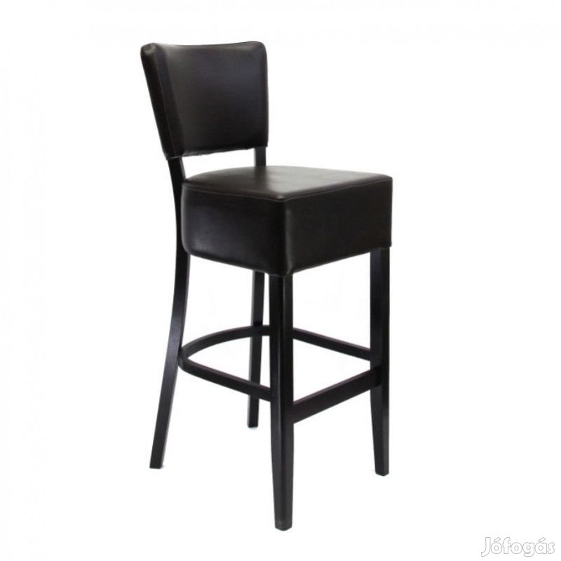 Tömörfa szerkezetű fix magasságú bárszék, pácolva, lakkozva, magas minőségű műbőr kárpitozással.