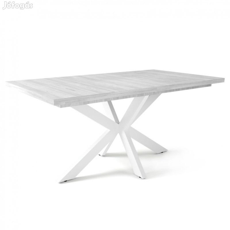Fehér színű, állítható porfestett szögletes fém lábbal, és választható színű, kinyitható, bővíthető duplungolt fa asztallappal rendelkező modern megjelenésű étkezőasztal.