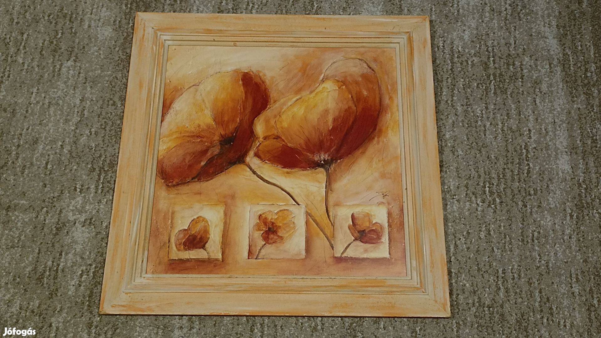 A keret bal alsó sarkában kicsit lejött a borítás,de az antikolt festés miatt ez alig vehető észre. Fotóztam közelről.