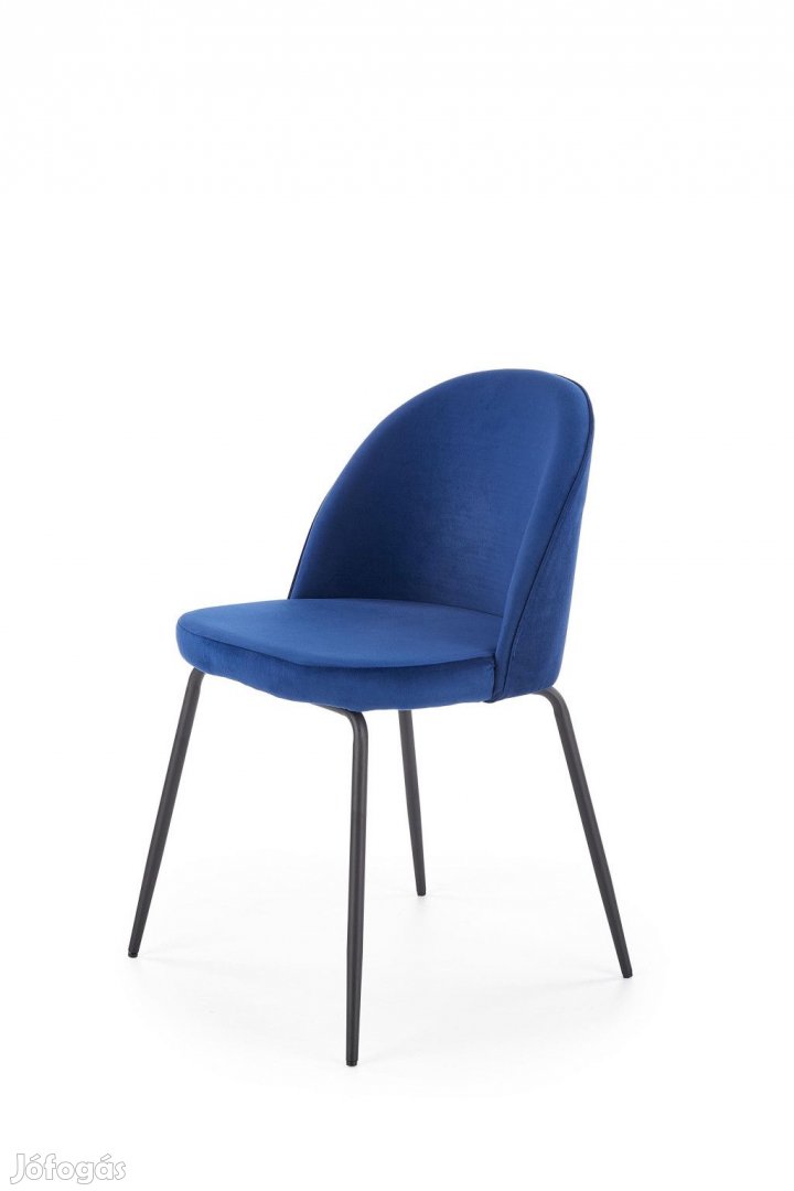 Az étkezőszék kárpitjának színe kék, a lábak színe fekete.