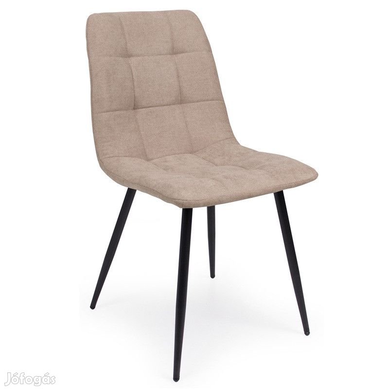 Ez a szék világosbarna színváltozatban, szövetből készült kárpittal, és fekete színű festett fém lábakkal kapható.
