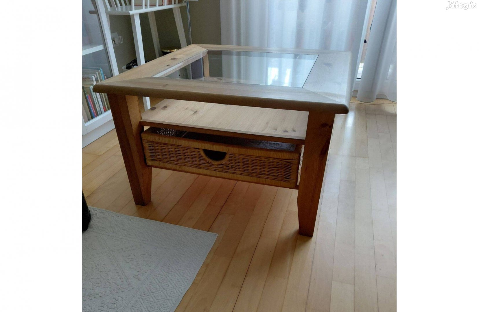 Tölgyfa asztal, üveglap a tetején, alatta egy polc, az alatt kihúzható rattan kosár