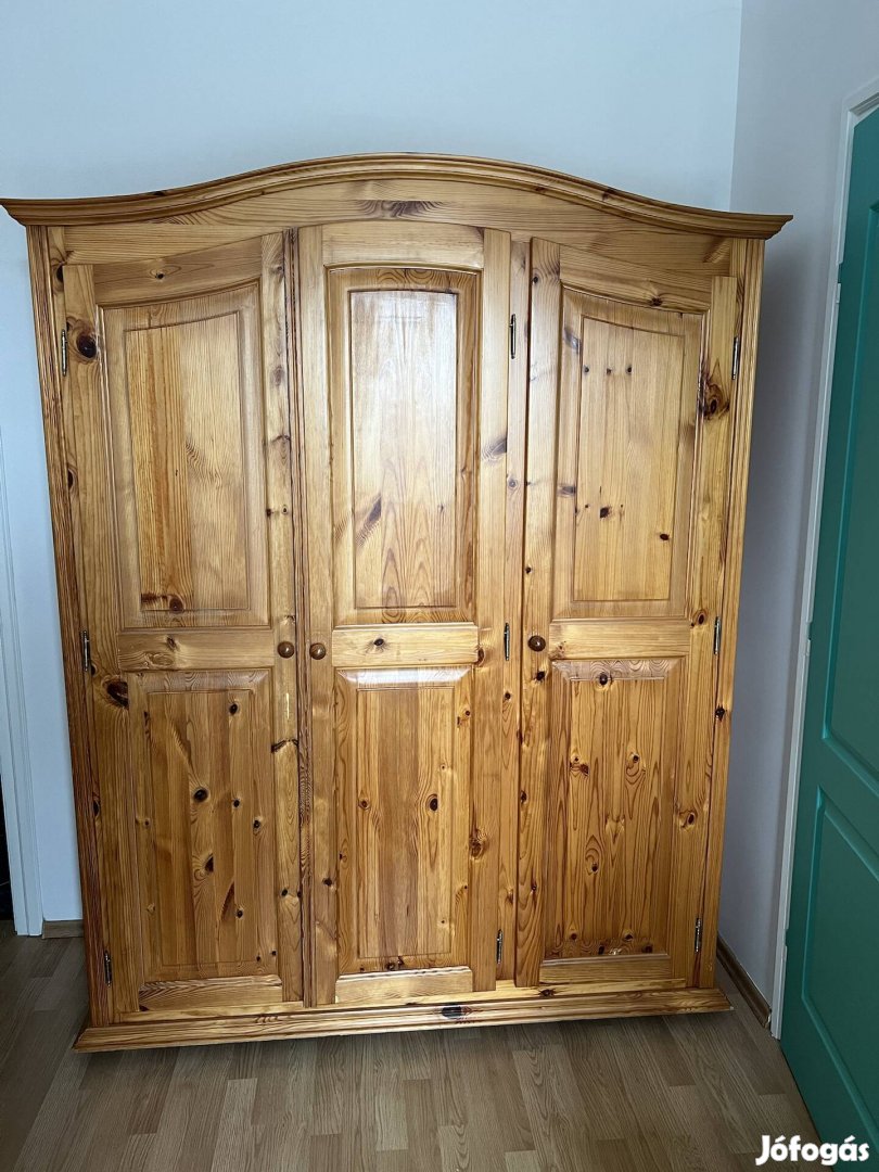 Tömör fenyő.Nagyon szép állapotú ruhásszekrény.Szé:150 cm.Mag:198 cm.Mély:53 cm.Sajnos megsérült a költözésnél,ezert most 15000 ft-ért vihető!