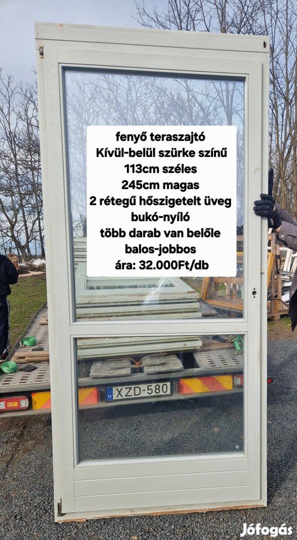 Eladó a képen látható bontott fenyő teraszajtó. Kívül-belül szürke színű, 2rétegű hőszigetelt üveg, bukó-nyíló, kilincs jár hozzá.