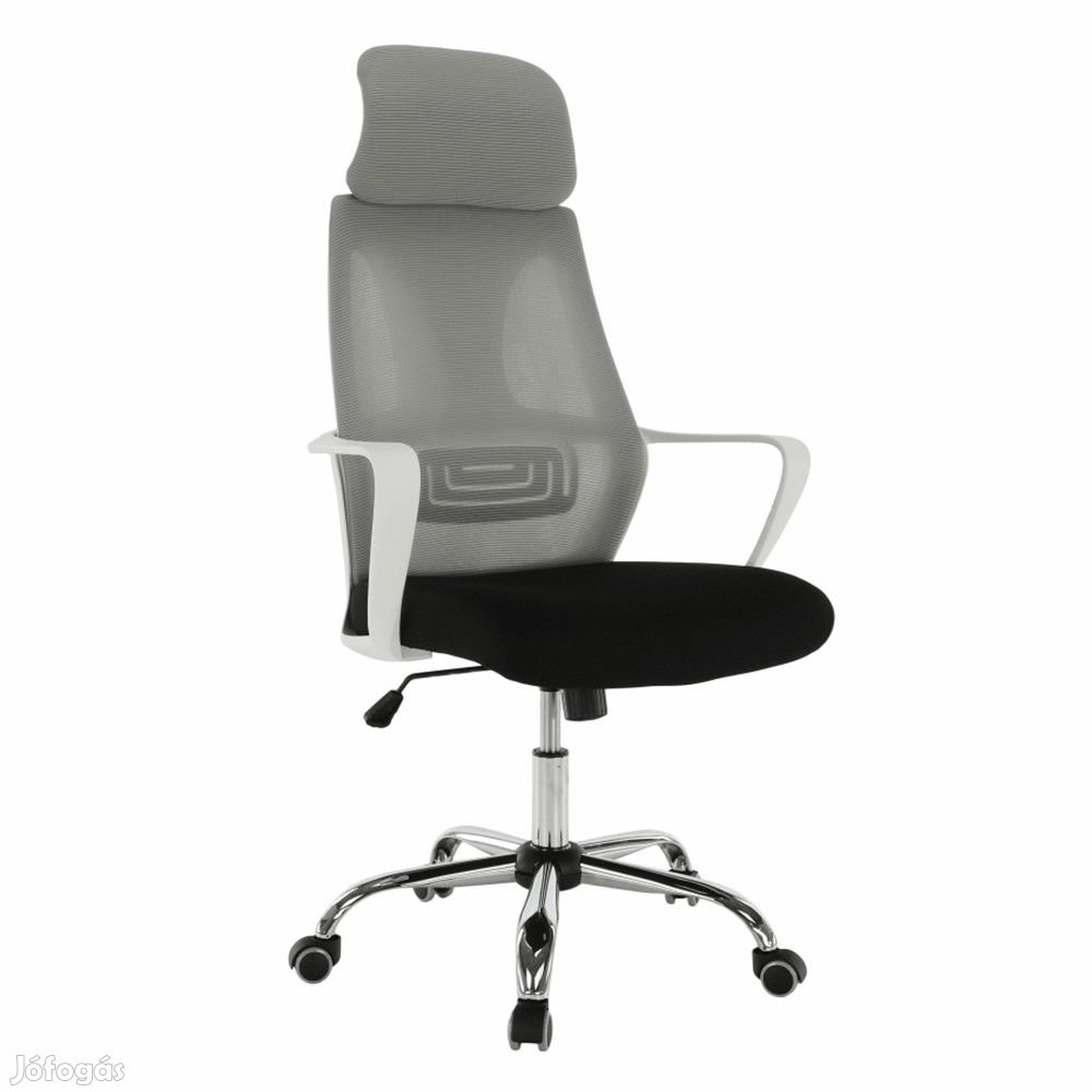 Szürke és fekete hálószövettel kárpitozott, műanyagból készült. A stabilitását a krómozott láb biztosítja. Az ülőrész magassága könnyen állítható a mechanizmussal, mely az ülőrész alatt található. A fehér kartámláknak és a fejtámláknak köszönhetően tökéletes pihenésben lesz része.