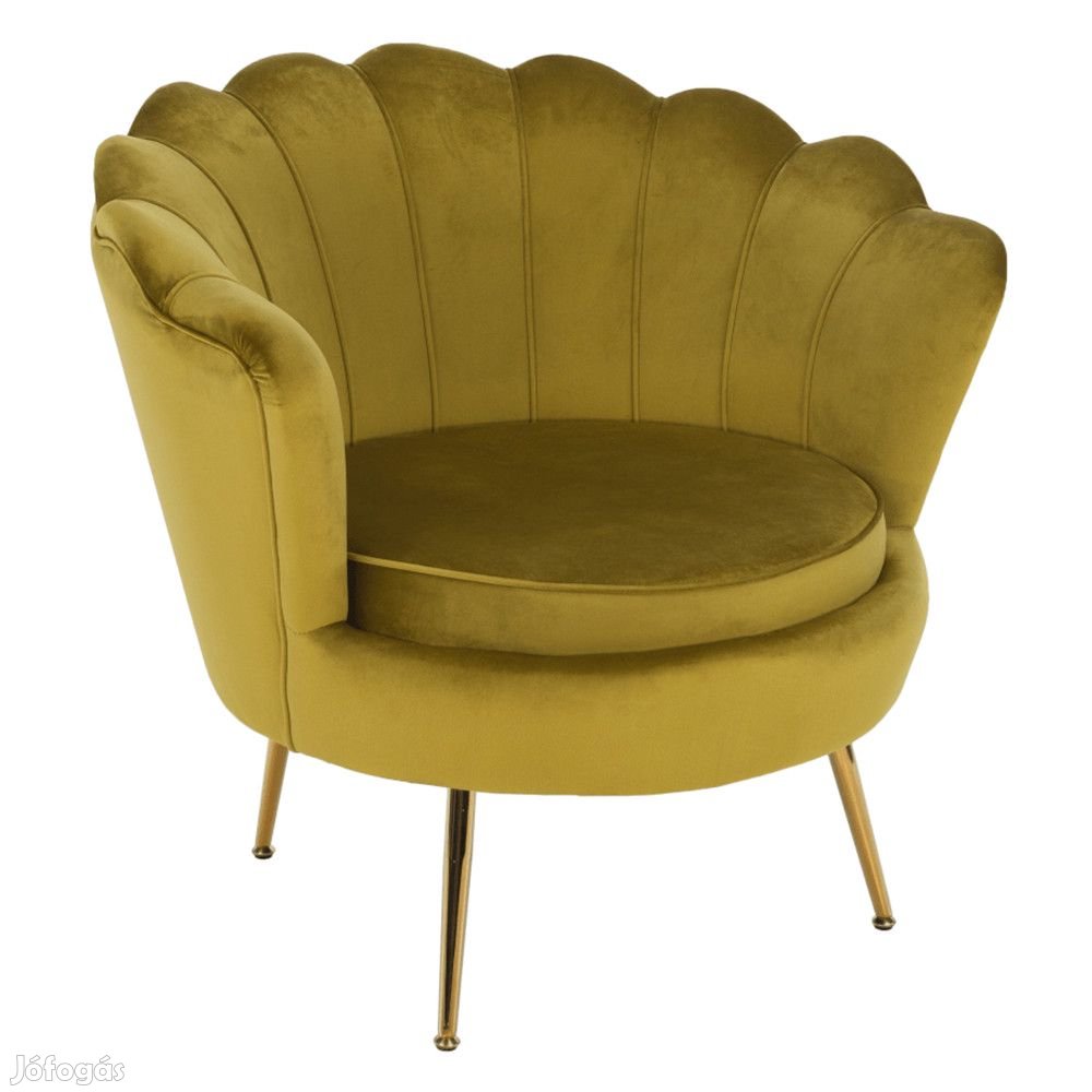 Ez a fotel meggyőz minden Art-deco stílust kedvelőt. A fotel tengeri kagyló alakja elbűvölő és luxus hatást kelt, karcsú fém lábai kellemesen lágyítják a masszív külsejét. A támla belső oldala dekoratív varrással díszített, kényelmes kerek üléssel kiegészítve. Ez a fotel jelképezi az Ön kifinomult ízlését.
