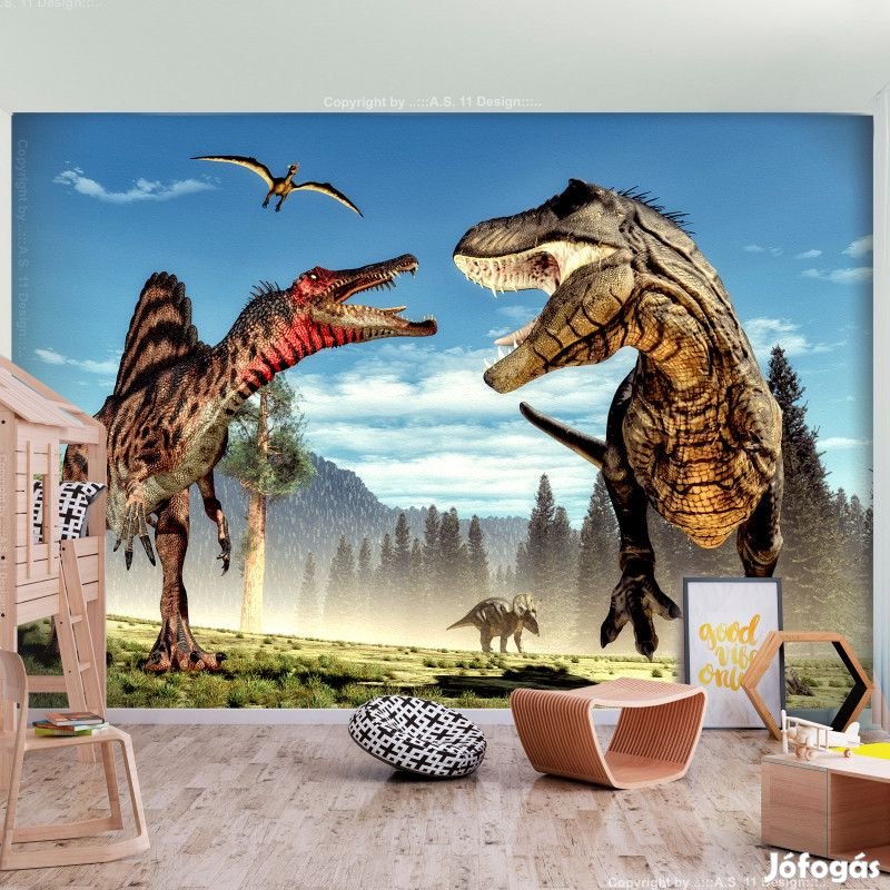 Tartós, víz és karcálló, falra ragasztható "Dínószauruszok harca" flíz fotótapéta. Az inspiráló motívummal ellátott "Dínószauruszok harca" című fotótapéta hatásosan díszít minden helyiséget. A flíz tapéták ragasztással kerülnek rögzítésre. Minden helyiségben felragasztható, még fürdőszobában vagy konyhában is. Flíz tapéta, fényes bevonat. A 100%-os flíz eltakarja a fal apró egyenetlenségeit. Egy melegítő szigetelő réteget alkot, de lehetővé teszi a fal lélegzését. A vízálló nyomtatás nagyon tartós.