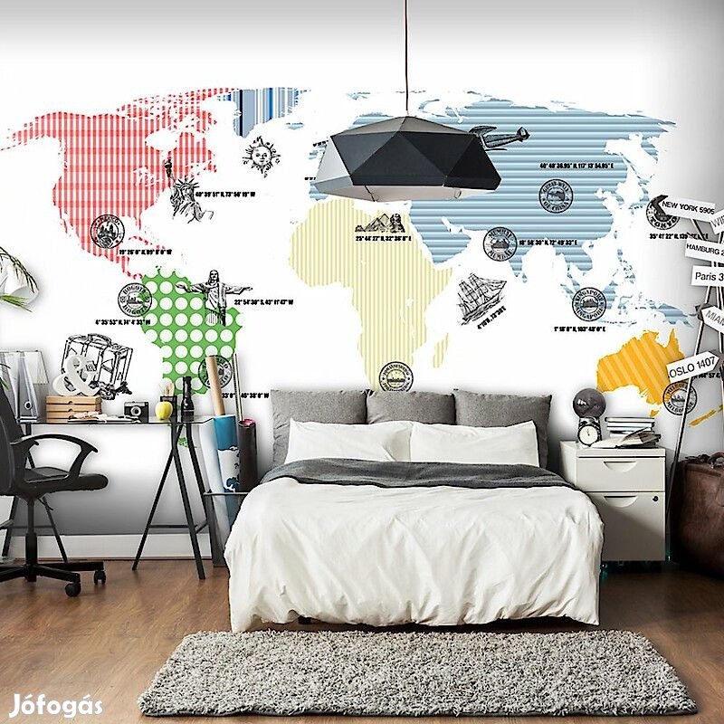 400x309: 50x309 50x309 50x309 50x309 50x309 50x309 50x309 50x309Tartós, víz és karcálló, falra ragasztható "Kozmopolita világtérkép" flíz fotótapéta. Az inspiráló motívummal ellátott Kozmopolita világtérkép című fotótapéta hatásosan díszít minden helyiséget. A flíz tapéták ragasztással kerülnek rögzítésre. Minden helyiségben felragasztható, még fürdőszobában vagy konyhában is. Flíz tapéta, fényes bevonat. A 100%-os flíz eltakarja a fal apró egyenetlenségeit. Egy melegítő szigetelő réteget alkot, de lehetővé teszi a fal lélegzését. A vízálló nyomtatás nagyon tartós.Magas minőségű nyomtatásAz egyedi technológiájú 600 dpi felbontású digitális nyomtatás, valamint az élénk színek azt eredményezik, hogy a flíz fotótapéta kitölti és megnagyobbítja az Ön házának belsejét.Egyszerű felszerelésA fotótapéta könnyedén rögzíthető, 50 cm-es sávokból rakódik össze.Környezetbarát és biztonságosA biztonságos anyagok használatára való tekintettel mintáinkat a hálószobádba, valamint a gyermekeid szobájába is tudjuk ajánlani.Biztonságos csomagolásA fotótapéta fel van tekerve és gyárilag egy kartontubusba van csomagolva, mely biztonságossá teszi a szállítást. Mindegyik tubus tartalmazza a felragasztásra vonatkozó utasításokat.Súly: 120 g/m2