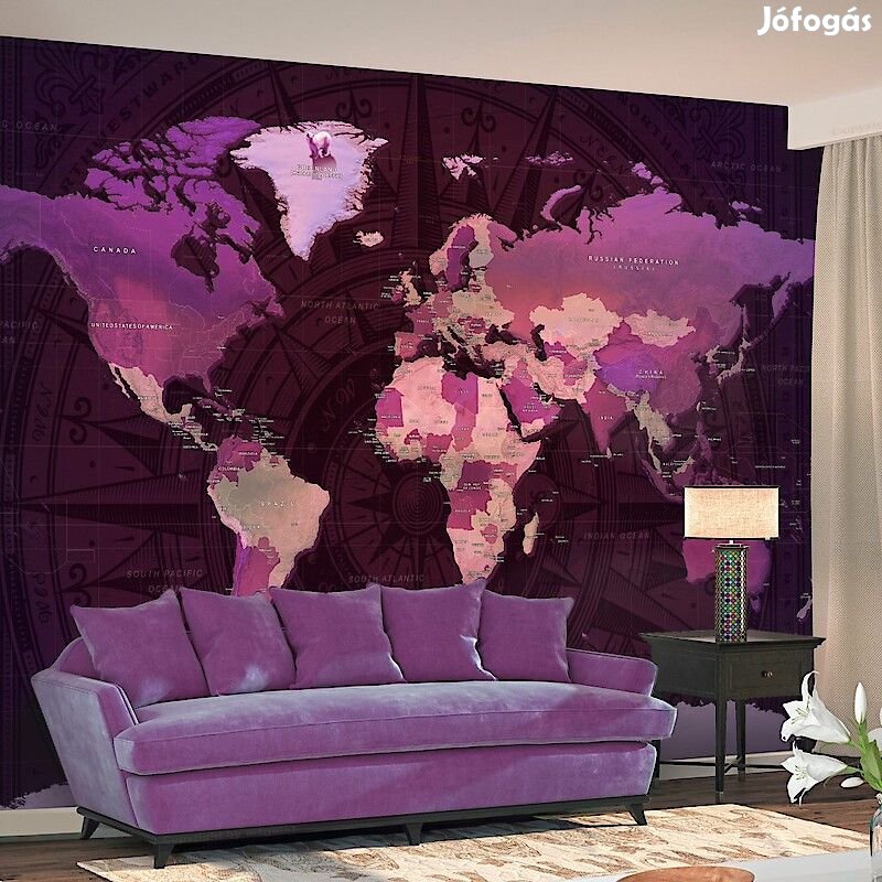 Tartós, víz és karcálló, falra ragasztható "Lila világtérkép" flíz fotótapéta. Az inspiráló motívummal ellátott "Lila világtérkép" című fotótapéta hatásosan díszít minden helyiséget. A flíz tapéták ragasztással kerülnek rögzítésre. Minden helyiségben felragasztható, még fürdőszobában vagy konyhában is. Flíz tapéta, fényes bevonat. A 100%-os flíz eltakarja a fal apró egyenetlenségeit. Egy melegítő szigetelő réteget alkot, de lehetővé teszi a fal lélegzését. A vízálló nyomtatás nagyon tartós.