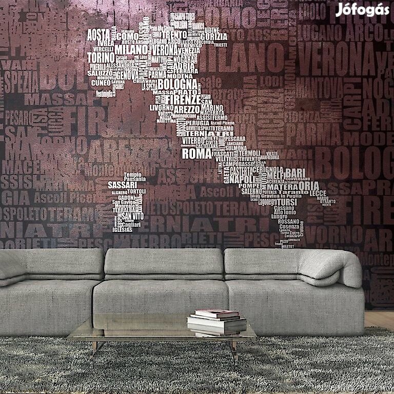 Tartós, víz és karcálló, falra ragasztható "Olaszország térképe városnevekből" flíz fotótapéta. Az inspiráló motívummal ellátott Olaszország térképe városnevekből című fotótapéta hatásosan díszít minden helyiséget. A flíz tapéták ragasztással kerülnek rögzítésre. Minden helyiségben felragasztható, még fürdőszobában vagy konyhában is. Flíz tapéta, fényes bevonat. A 100%-os flíz eltakarja a fal apró egyenetlenségeit. Egy melegítő szigetelő réteget alkot, de lehetővé teszi a fal lélegzését. A vízálló nyomtatás nagyon tartós.
