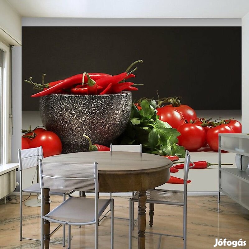 400x309: 50x309 50x309 50x309 50x309 50x309 50x309 50x309 50x309Tartós, víz és karcálló, falra ragasztható "Piros paprikák és paradicsomok" flíz fotótapéta. Az inspiráló motívummal ellátott Piros paprikák és paradicsomok című fotótapéta hatásosan díszít minden helyiséget. A flíz tapéták ragasztással kerülnek rögzítésre. Minden helyiségben felragasztható, még fürdőszobában vagy konyhában is. Flíz tapéta, fényes bevonat. A 100%-os flíz eltakarja a fal apró egyenetlenségeit. Egy melegítő szigetelő réteget alkot, de lehetővé teszi a fal lélegzését. A vízálló nyomtatás nagyon tartós.Magas minőségű nyomtatásAz egyedi technológiájú 600 dpi felbontású digitális nyomtatás, valamint az élénk színek azt eredményezik, hogy a flíz fotótapéta kitölti és megnagyobbítja az Ön házának belsejét.Egyszerű felszerelésA fotótapéta könnyedén rögzíthető, 50 cm-es sávokból rakódik össze.Környezetbarát és biztonságosA biztonságos anyagok használatára való tekintettel mintáinkat a hálószobádba, valamint a gyermekeid szobájába is tudjuk ajánlani.Biztonságos csomagolásA fotótapéta fel van tekerve és gyárilag egy kartontubusba van csomagolva, mely biztonságossá teszi a szállítást. Mindegyik tubus tartalmazza a felragasztásra vonatkozó utasításokat.Súly: 120 g/m2