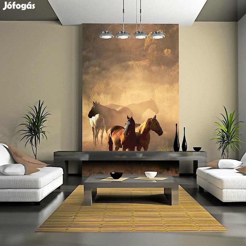 Tartós, víz és karcálló, falra ragasztható "Vad lovak a steppe" flíz fotótapéta. Az inspiráló motívummal ellátott Vad lovak a steppe című fotótapéta hatásosan díszít minden helyiséget. A flíz tapéták ragasztással kerülnek rögzítésre. Minden helyiségben felragasztható, még fürdőszobában vagy konyhában is. Flíz tapéta, fényes bevonat. A 100%-os flíz eltakarja a fal apró egyenetlenségeit. Egy melegítő szigetelő réteget alkot, de lehetővé teszi a fal lélegzését. A vízálló nyomtatás nagyon tartós.