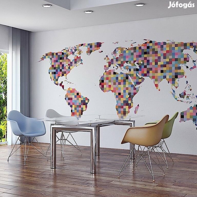 Tartós, víz és karcálló, falra ragasztható "Világtérkép színes négyzetekből" flíz fotótapéta. Az inspiráló motívummal ellátott Világtérkép színes négyzetekből című fotótapéta hatásosan díszít minden helyiséget. A flíz tapéták ragasztással kerülnek rögzítésre. Minden helyiségben felragasztható, még fürdőszobában vagy konyhában is. Flíz tapéta, fényes bevonat. A 100%-os flíz eltakarja a fal apró egyenetlenségeit. Egy melegítő szigetelő réteget alkot, de lehetővé teszi a fal lélegzését. A vízálló nyomtatás nagyon tartós.