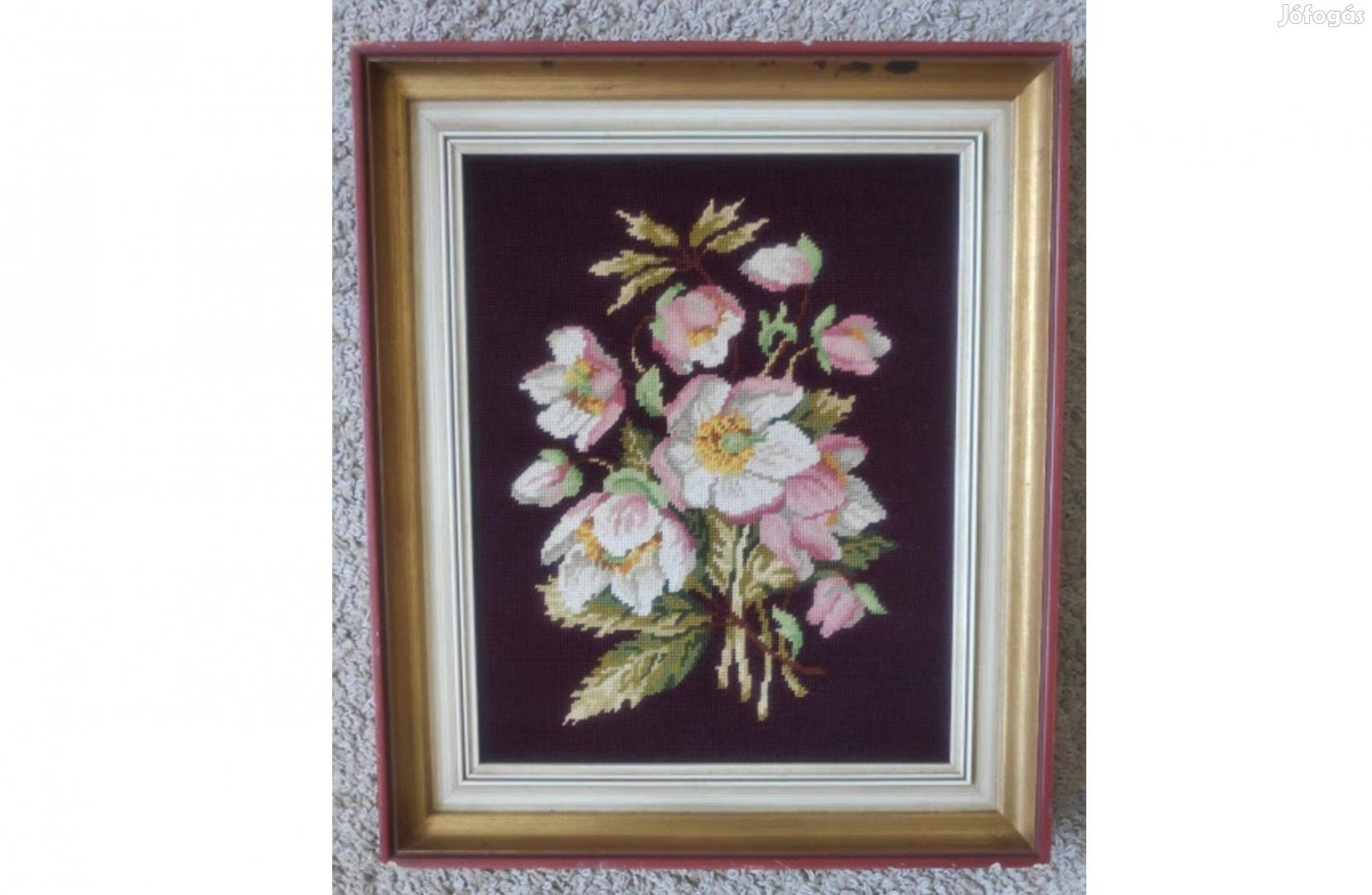 Gyapjúfonallal kivart gobelinkép fakeretben