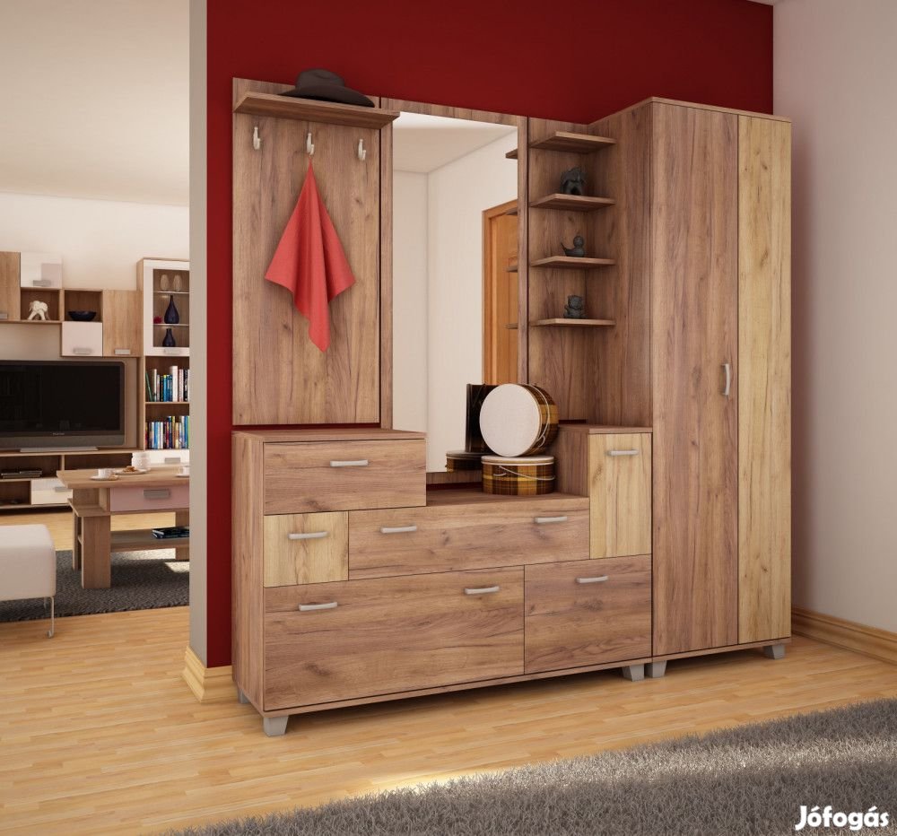 Előszobafal tükörrel, fiókokkal, cipőtartó szekrényekkel, fogasokkal, nyitott polcokkal, magas vállfatartós szekrénnyel, tobacco tölgy és arany tölgy színben. További információkért kattintson ide:
