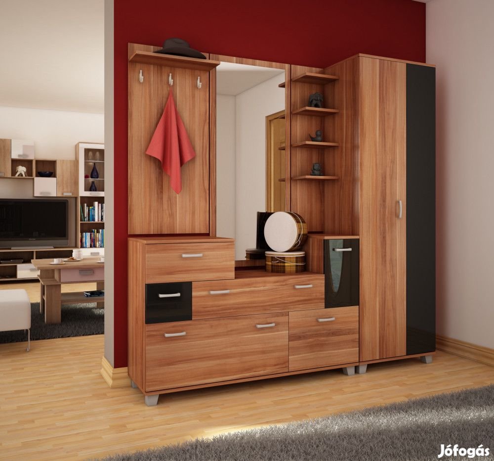 Előszobafal tükörrel, fiókokkal, cipőtartó szekrényekkel, fogasokkal, nyitott polcokkal, magas vállfatartós szekrénnyel, szilva és fényes fekete színben. További információkért kattintson ide:
