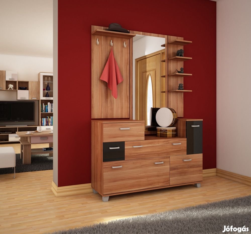 Előszobafal tükörrel, fiókokkal, cipőtartó szekrényekkel, fogasokkal, nyitott polcokkal, szilva és fényes fekete színben. További információkért kattintson ide: