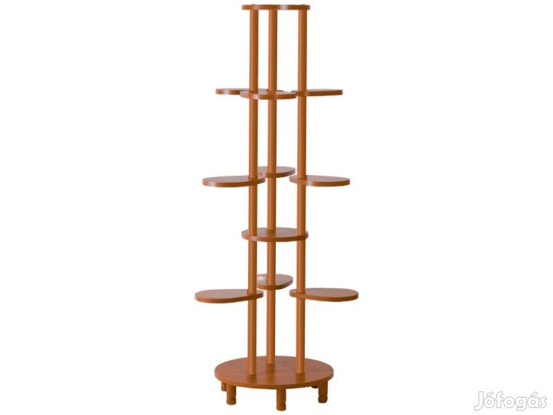 Nagyméretű, klasszikus megjelenésű fa virágtartó állvány fóliázott polcokkal, henger alakú esztergált rudakkal.