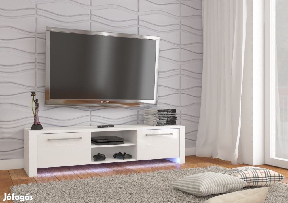 TV-állvány 2 lenyíló ajtóval és nyitott polcokkal, fehér és fényes fehér színben. További információkért kattintson ide: