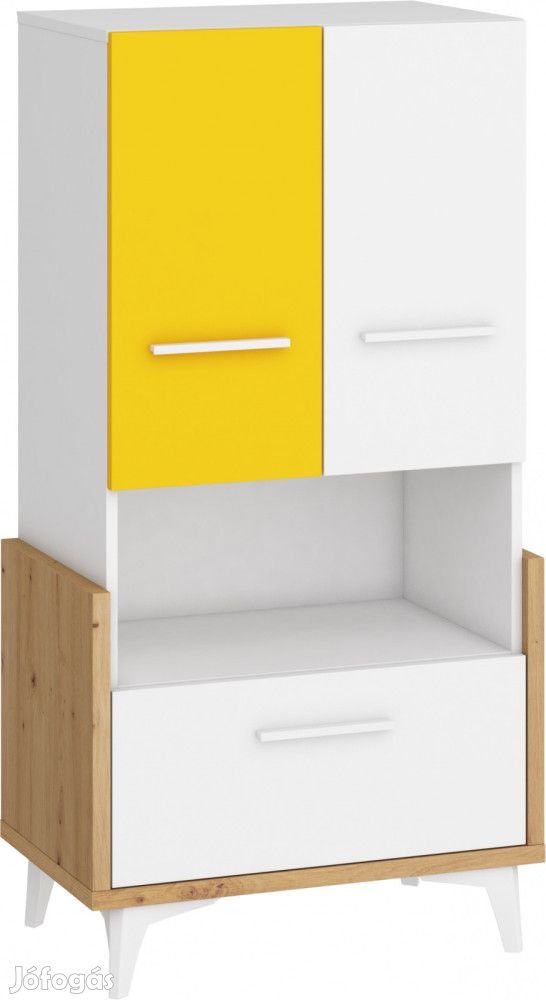 Könyvespolc 2 ajtóval, 1 fiókkal, nyitott polcokkal, az ajtó mögött polccal, artisan tölgy, fehér és sárga színben. További információkért kattintson ide: