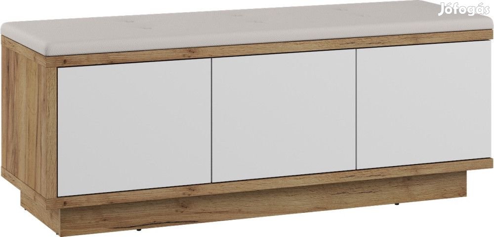 Alacsony ülőkés szekrény 3 ajtóval, belül polcokkal, ülőpárnával a tetején, arany tölgy és fényes fehér színben, bézs huzattal. További információkért kattintson ide: