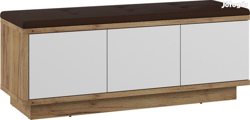 Alacsony ülőkés szekrény 3 ajtóval, belül polcokkal, ülőpárnával a tetején, arany tölgy és fényes fehér színben, barna huzattal. További információkért kattintson ide: