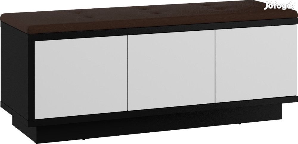 Alacsony ülőkés szekrény 3 ajtóval, belül polcokkal, ülőpárnával a tetején, fekete és fényes fehér színben, barna huzattal. További információkért kattintson ide:
