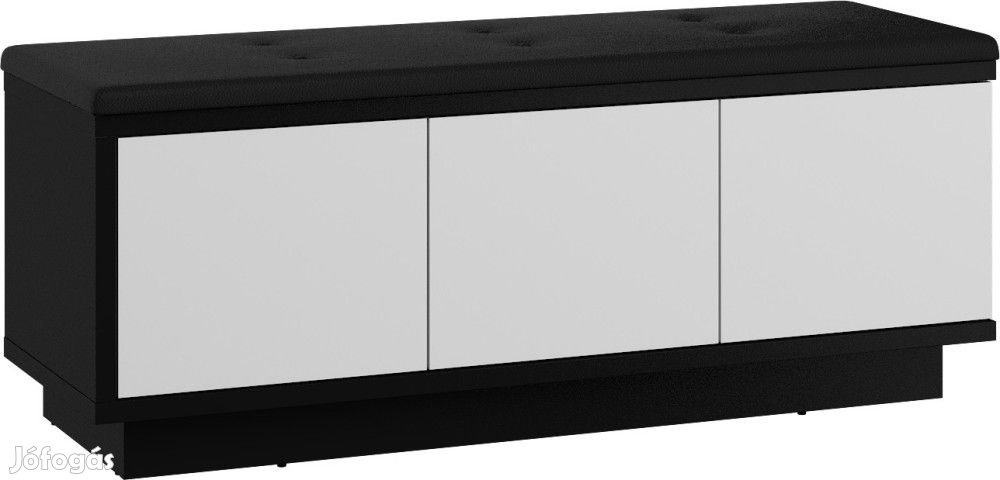 Alacsony ülőkés szekrény 3 ajtóval, belül polcokkal, ülőpárnával a tetején, fekete és fényes fehér színben, fekete huzattal. További információkért kattintson ide: