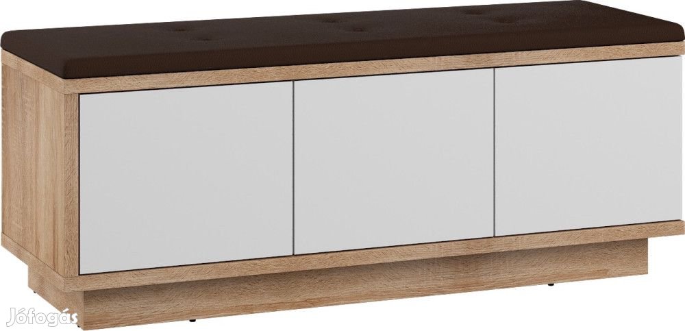 Alacsony ülőkés szekrény 3 ajtóval, belül polcokkal, ülőpárnával a tetején, világos sonoma tölgy és fényes fehér színben, barna huzattal. További információkért kattintson ide: