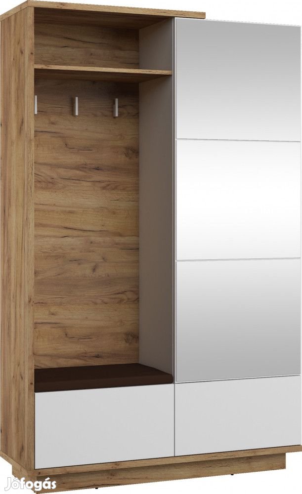 Előszobafal vállfatartós szekrénnyel, tükörrel, lenyílós cipőtartó szekrényekkel, fogasokkal, ülőkés szekrénnyel és ülőpárnával, arany tölgy és fényes fehér színben, barna huzattal. További információkért kattintson ide: