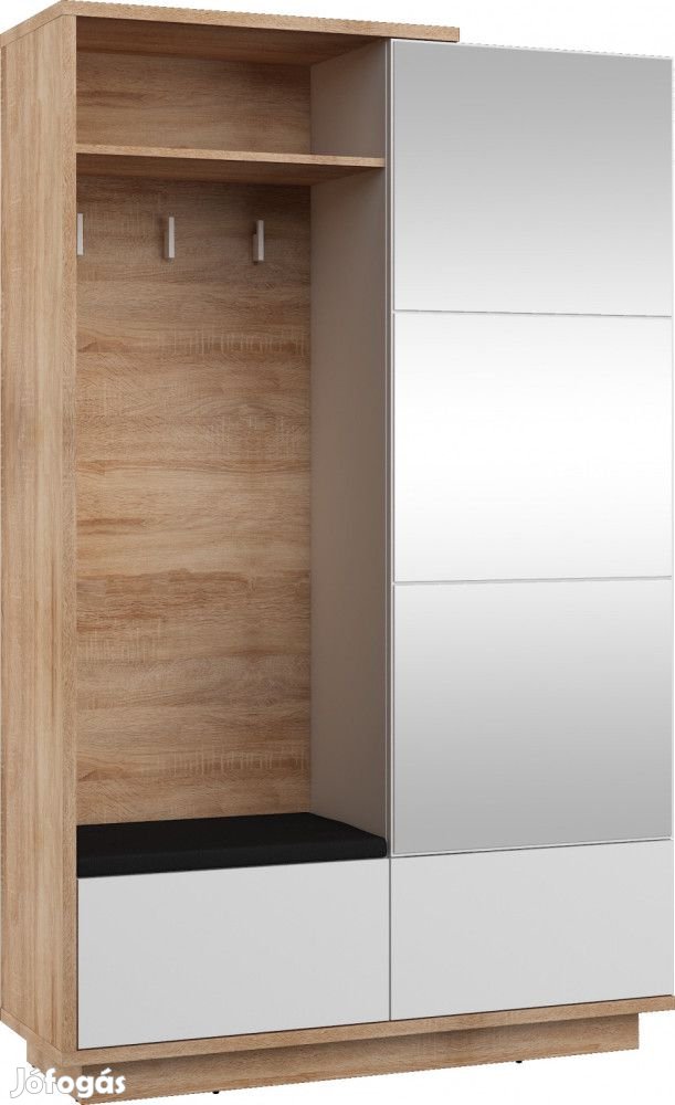 Előszobafal vállfatartós szekrénnyel, tükörrel, lenyílós cipőtartó szekrényekkel, fogasokkal, ülőkés szekrénnyel és ülőpárnával, világos sonoma tölgy és fényes fehér színben, fekete huzattal. További információkért kattintson ide: