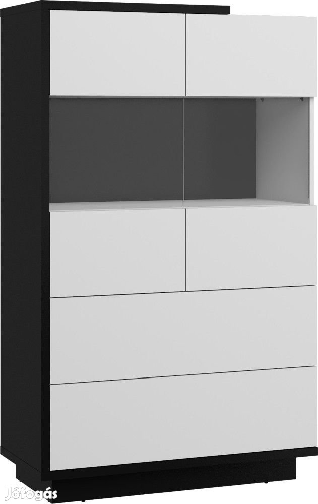 Részben üveges, 2-ajtós, 2-fiókos vitrines szekrény, az ajtó mögött végig polcokkal, fekete és fényes fehér színben. További információkért kattintson ide: