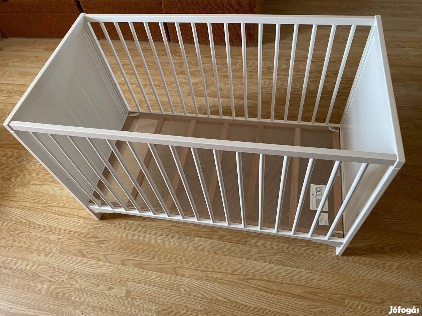 Eladó szerkezetileg hibátlan állapotú kiságy, az egyik oldalon a felső vízszintes lécen fogzásból adódó karcok.